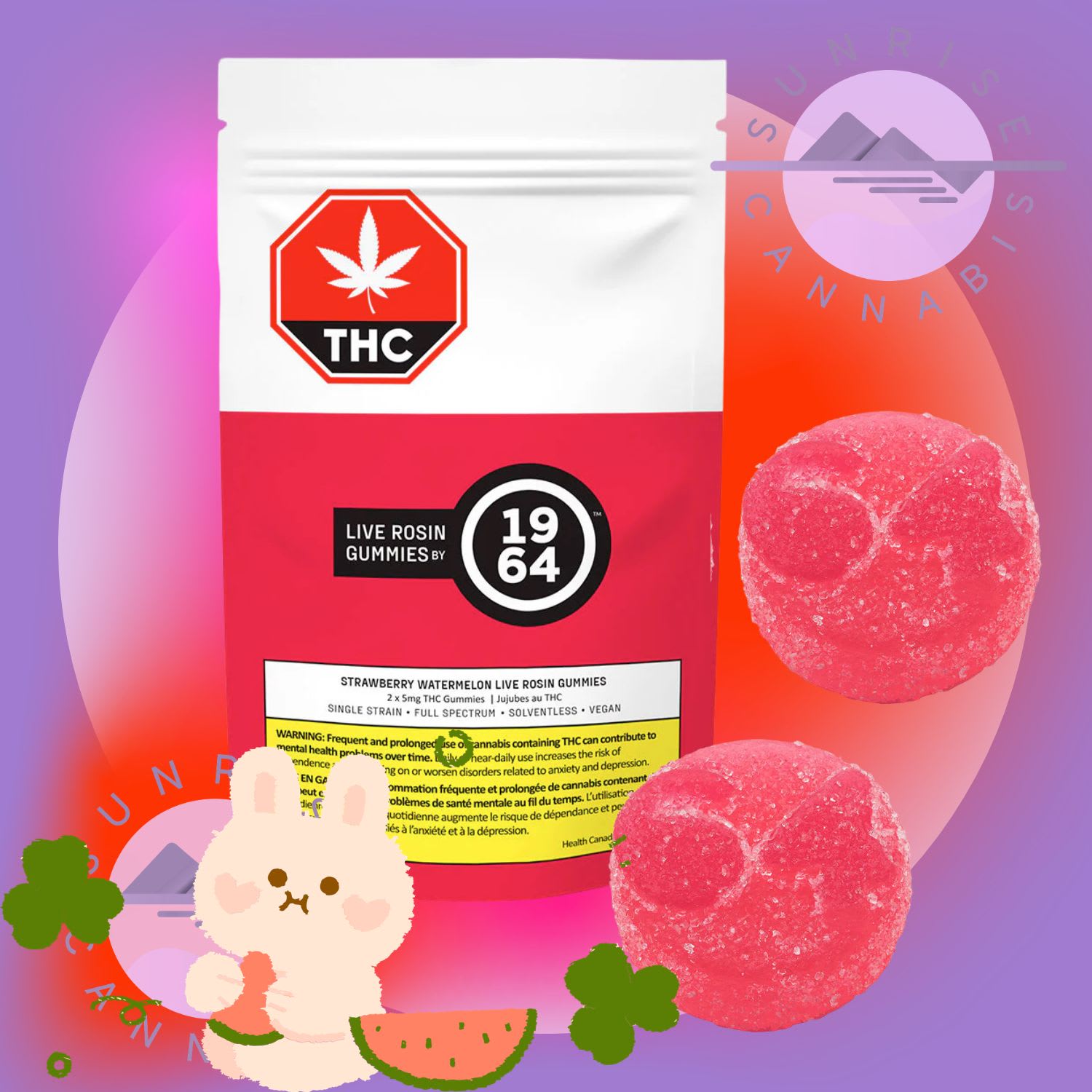 GUMMIES - THC - LVE ROSIN - 2x5MG A 2-pack of vegan, live rosin chews from 1964. Mouth-watering Strawberry Watermelon flavour, each chew with 5mg THC.