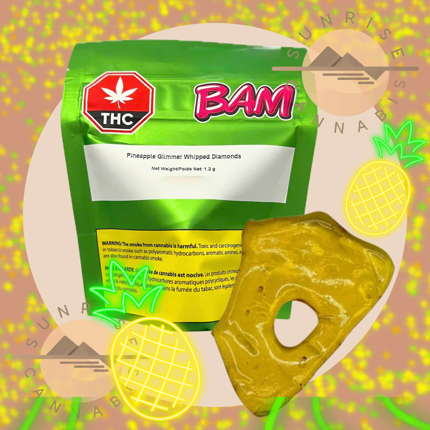 Pineapple Glimmer Whipped Diamonds are BAM's newest innovation. THCA Diamonds whipped with cannabis derived terp sauce with a dash of botanical terps to create this new texture. Packed with flavour and potency, diamond whips are here to wow!