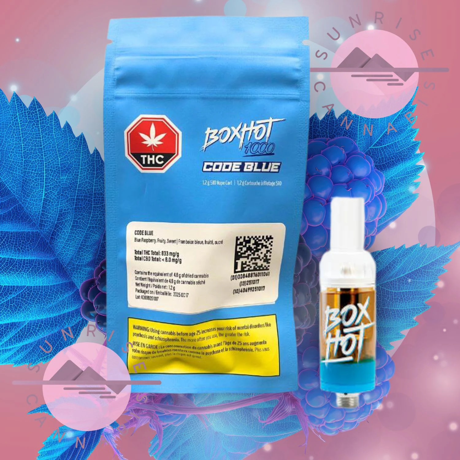 BOXHOT PRESENTS: Code Blue, a 1.2g hybrid 510 vape with a colossal 1000mg of THC and some of the purest cannabis distillate available on the market. Brace for a steady blue razz rhythm and a burst of fruity flavour with a custom blend of expertly infused botanical terpenes to kickstart your tastebuds.