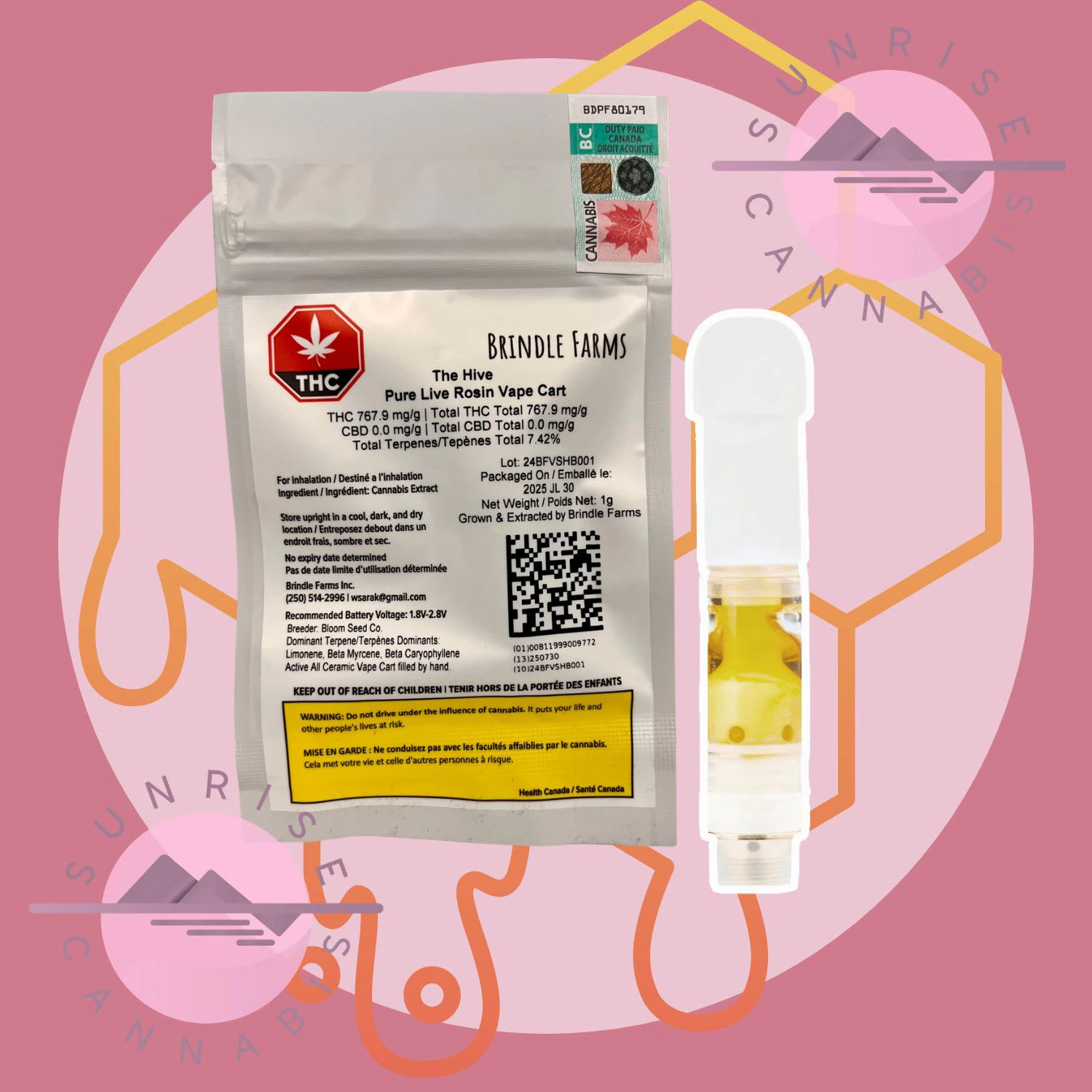 The Hive Live Rosin Vape Cart is a cross between Honey Banana x Papaya bred by Bloom Seed Co. Single-source, in-house cultivated, and extracted solventlessly using the HashTek system. Sativa-dominant rosin with a golden-yellow oil. Flavours of ripe papaya, sweet honey, and tart banana. Available for a limited-time-only.