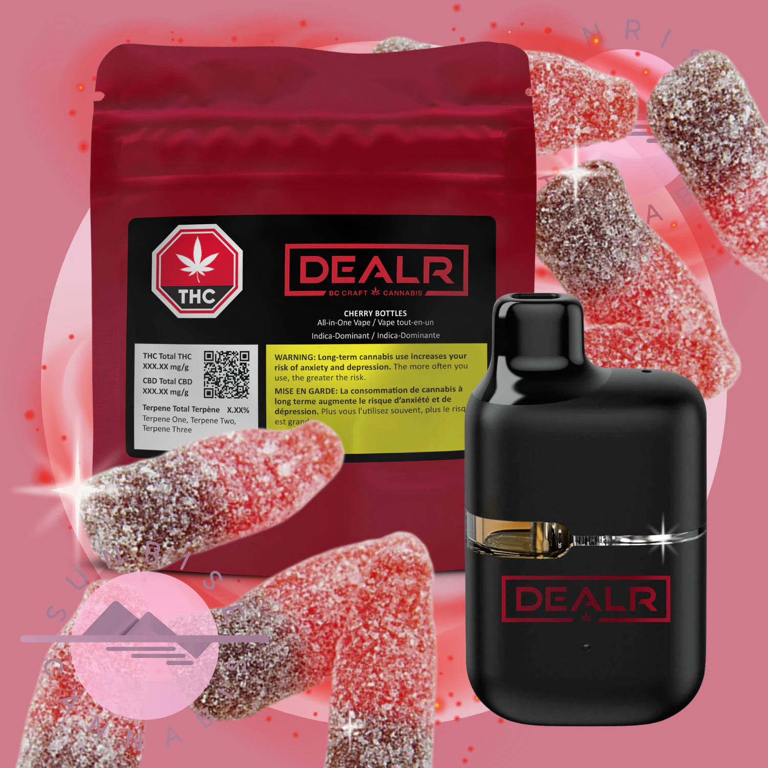 Crack open Cherry Bottles, the indica-dominant all-in-one for those who savour taste without making a scene. From Cherry Cookies and Zkittles BX1, sweet cherry flavouring pours over crisp cola fizz for a candy-soda hit that’s smooth from start to finish. Powered by a plant-based cannabis formulation and enhanced with natural terpenes, Cherry Bottles delivers flavour-packed pulls in a rechargeable device with a USB-C port.
