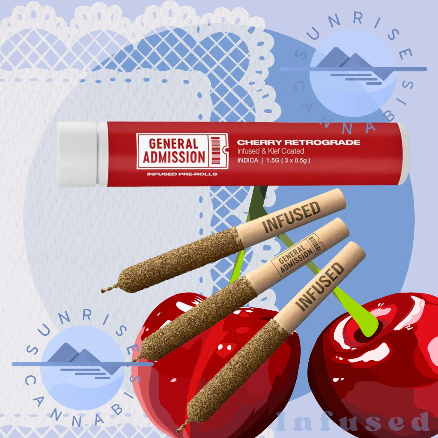 Cherry Retrograde takes cherry to a tropical dimension. Unlock all the layers of flavours you crave: tart fresh cherries, sweet pineapple and red berries, with a citrus burst. General Admission Diamond Infused Pre-Rolls are made with a trusted base of quality milled whole flower and boosted with a custom infusion of liquid THCa diamonds, and finished with a triple-distilled distillate and kief coating.