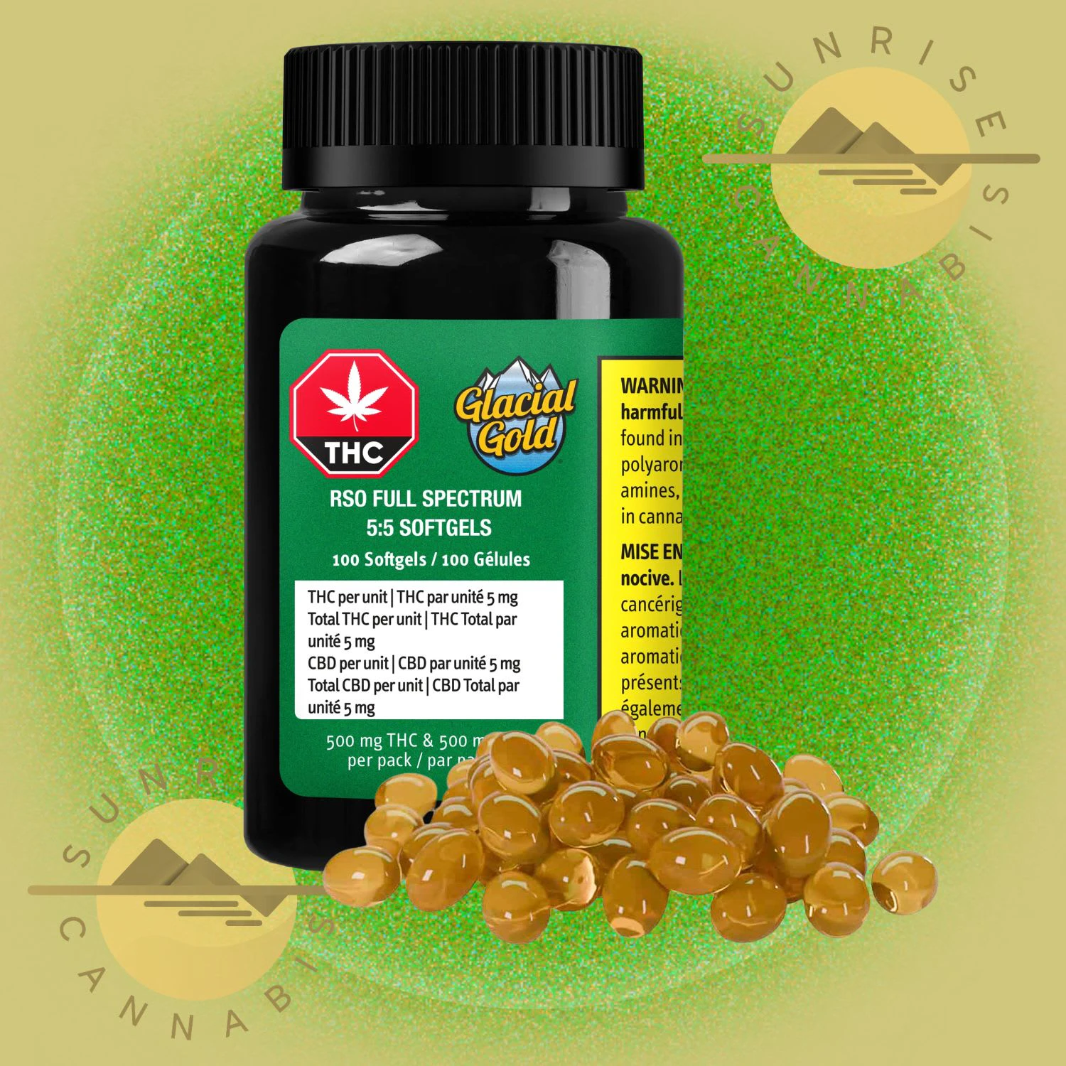 Glacial Gold RSO Full Spectrum 5:5 Softgels deliver a balanced blend of 5mg THC and 5mg CBD in each premium softgel. Organic hemp oil is infused with RSO cannabis extracts, delivering an all-cannabis formula that's consistent and convenient.