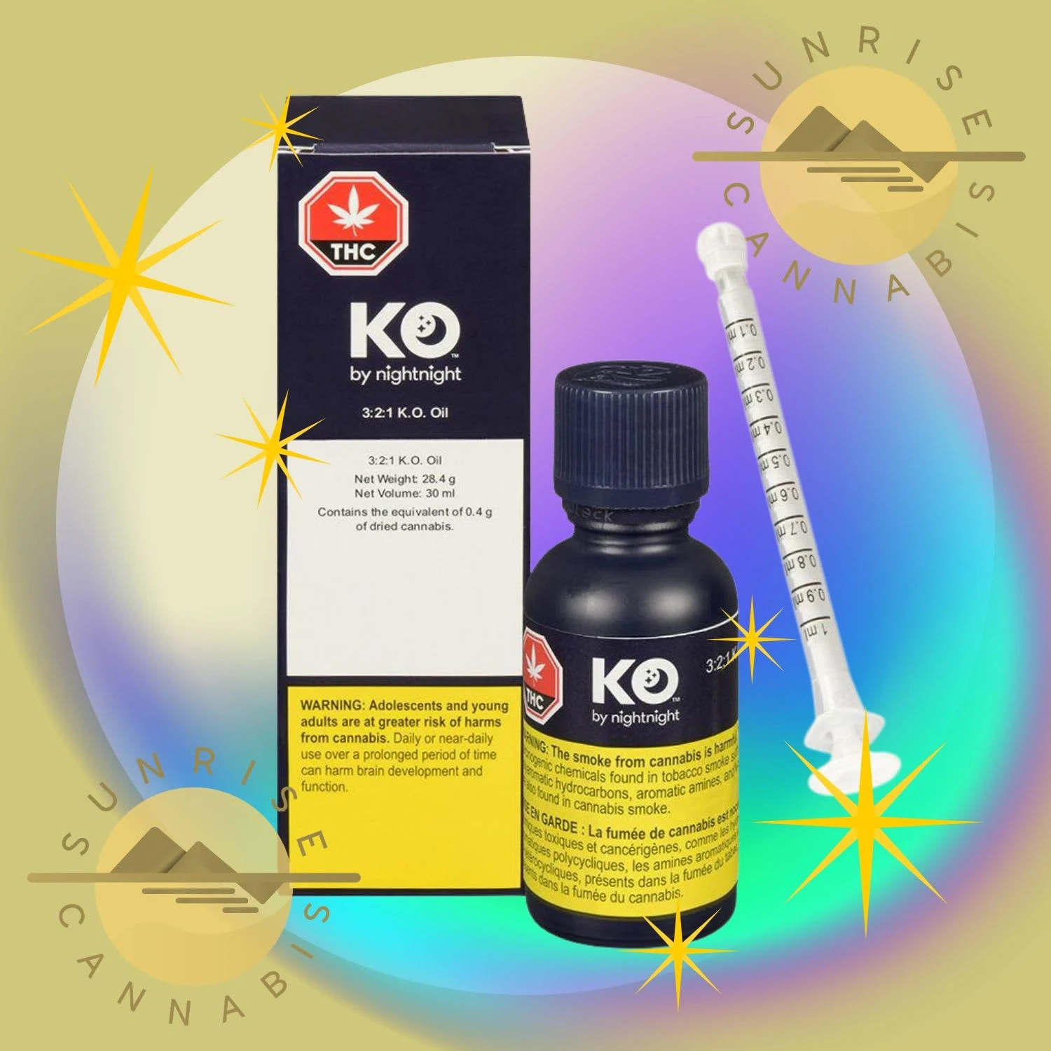 3:2:1 K.O. Oil is a formulation with a 3:2:1 CBD:CBN:THC ratio (30mg CBD + 20mg CBN + 10mg THC per 1ml x 30ml). Developed by the creators of NightNight, this oil has a high-potency profile from THC in addition to supercharged levels of CBN and CBD, all derived from cannabis. Enhanced with over 20 natural, indica-strain terpenes including Linalool, Myrcene, Limonene, and Caryophyllene.