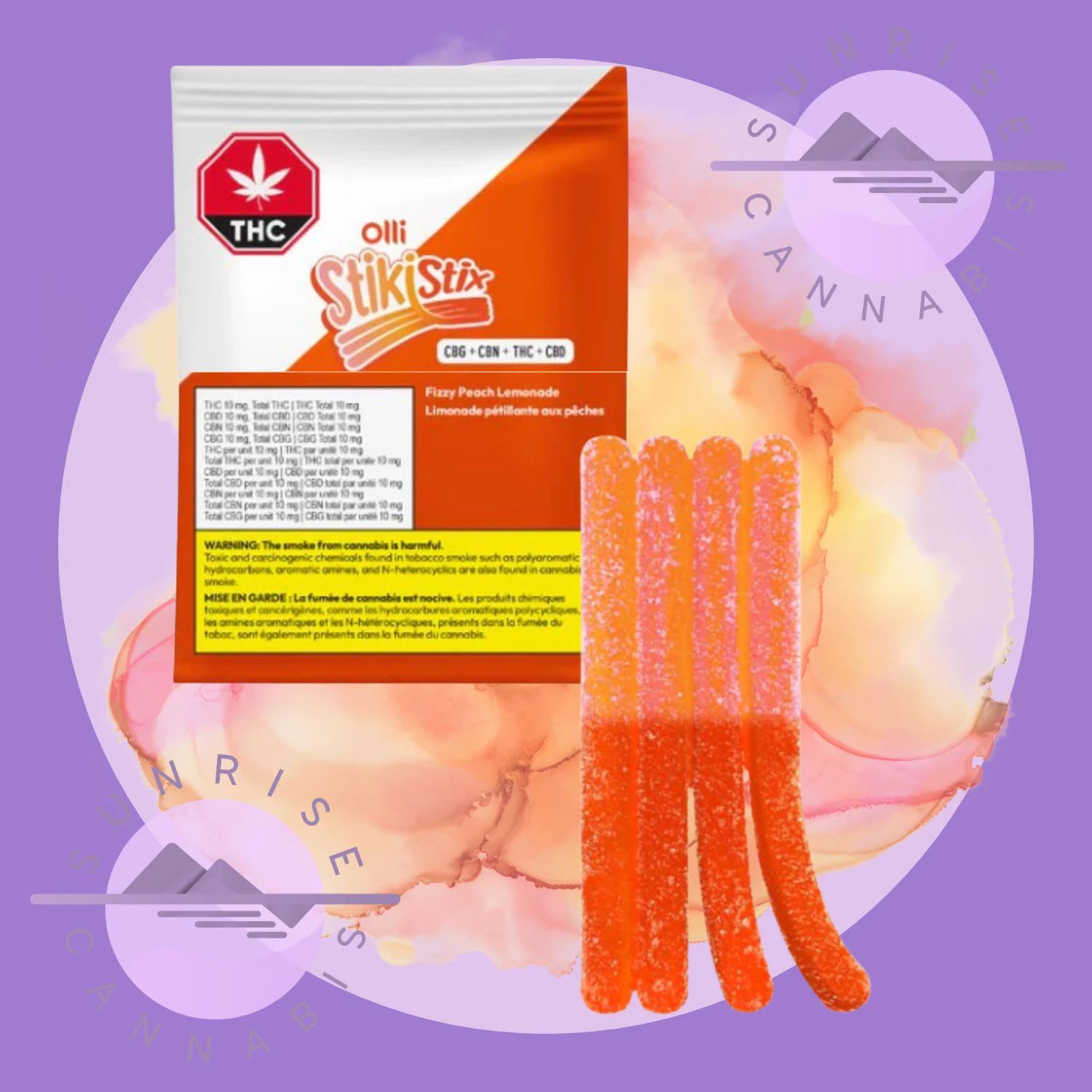 GUMMY - THC+CBG+CBN+CBD - 10MG - STRIPS Packed with a total of 10mg of each THC, CBG, CBN, CBD, and with a juicy fusion of Peach Lemonade, Olli StikiStix feature a chewy texture and a unique shape allowing you to split them into four strips.