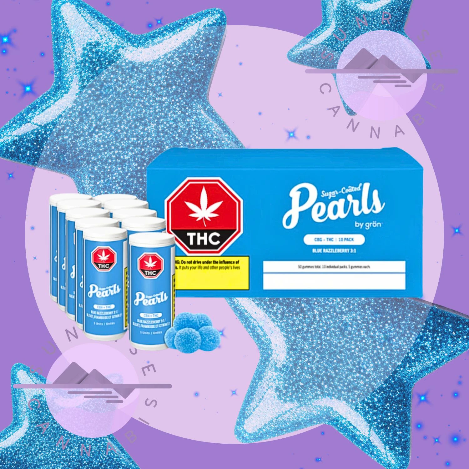 Canada's favourite gummy is now in a grab 'n go bag. 10 individual tubes each with 5 best-selling Blue Razzleberry Pearls in a 3:1 CBG/THC ratio. Each sugar-coated soft chew has 6mg of CBG and 2mg of THC. These Pearls are bursting with bright blueberries, raspberries, and lemons.