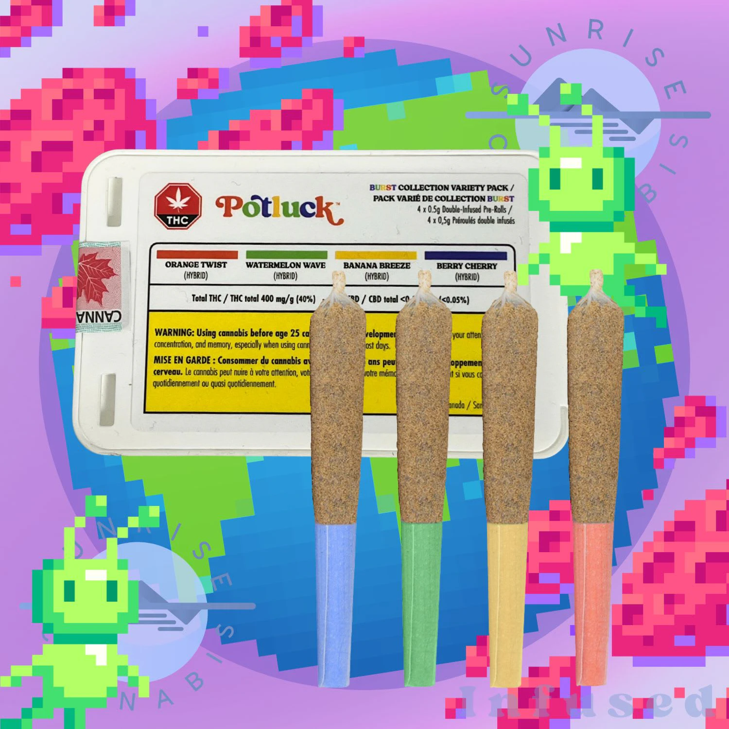 Introducing the Burst Collection by Potluck. Explore an array of robust cannabis fruit flavours in our convenient THC-infused pre-roll variety pack. This collection includes four options: Berry Cherry, Watermelon Wave, Banana Breeze, and Orange Twist. Every pre-roll in the Burst Collection is meticulously hand finished and thoughtfully packaged in a case complete with a two-way humid pack for ultimate freshness.