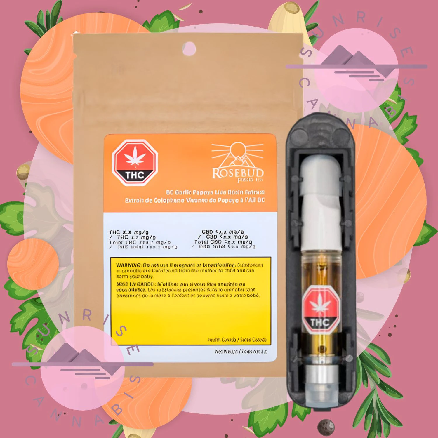 The BC Garlic Papaya Live Rosin Cart is an indica-dominant cultivar that was created by combining Chem and the infamous Girl Scout Cookies, crossed to Papaya, and is sun-grown in the Kootenays using regenerative farming techniques at Rosebud Cannabis Farms. As a solventless Live Rosin Cart, it boasts up to 7% terpenes, with a flavour profile of sweet papaya followed by dank woody, earth tones. It is sure to envelope your senses. This pure rosin vape cart is a convenient way to enjoy the premium flavour of live rosin.