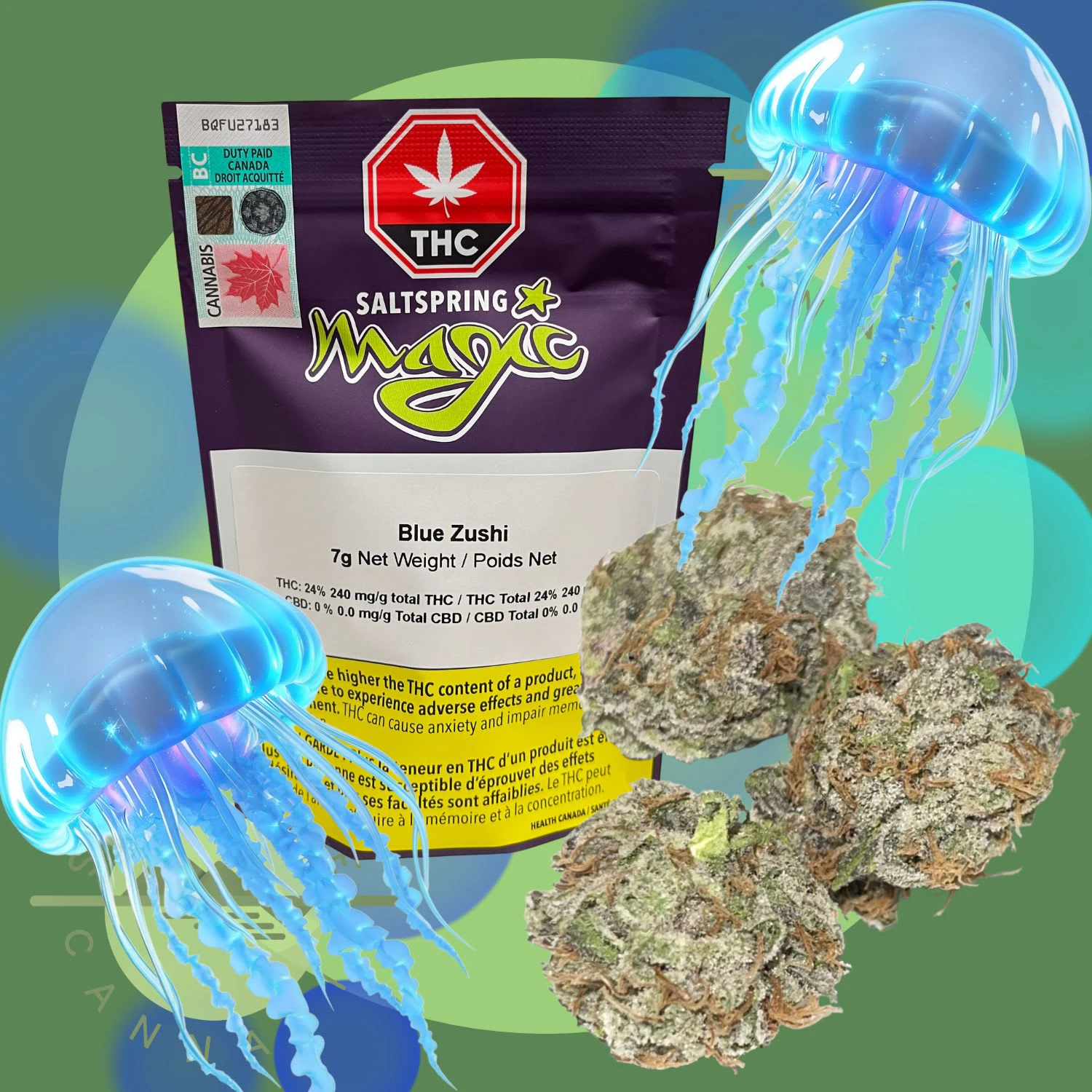 Blue Zushi is an indica-dominant hybrid cannabis strain made by crossing Zkittlez and Kush Mints. The effects of Blue Zushi are believed to be euphoric and relaxing. Medical marijuana patients say they buy Blue Zushi for stress and cachexia. The dominant terpenes are limonene and caryophyllene, creating a sweet, and slightly tropical nose that tastes great.