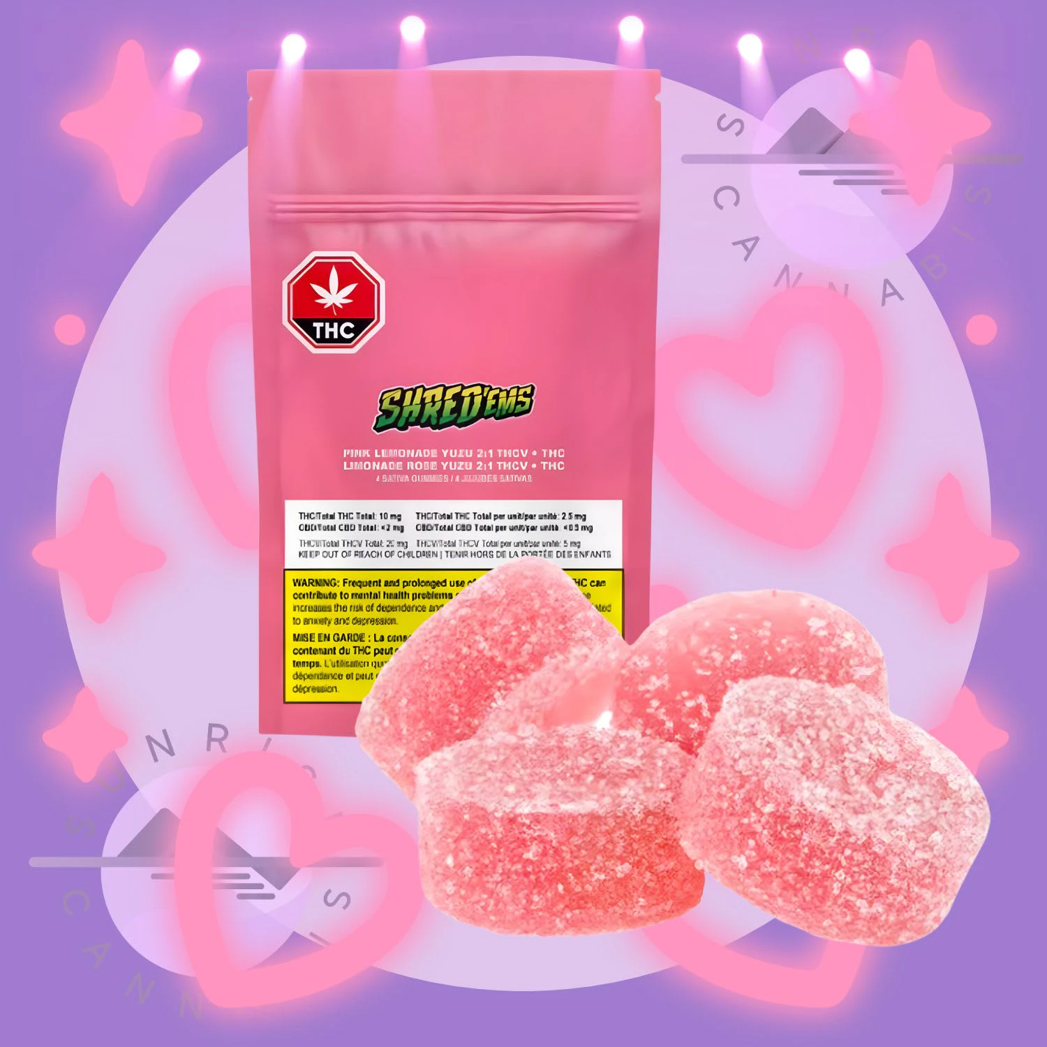 Pink Lemonade Yuzu 2:1 THCV:THC Gummies from SHRED'ems comes in a pack of four gummies, with each gummy containing 2.5 mg of THC and 5 mg of THCV. SHRED'ems are made with cannabis extract, as well as Sugars, Water, Pectin, Natural flavour, Citric acid, Sodium citrate, Modified coconut oil, Brilliant Blue FCF, Anthocyanins, Caramel, Carnauba wax, Alpha-tocopherol. SHRED'ems Pink Lemonade Yuzu 2:1 THCV:THC Gummies are vegan friendly.