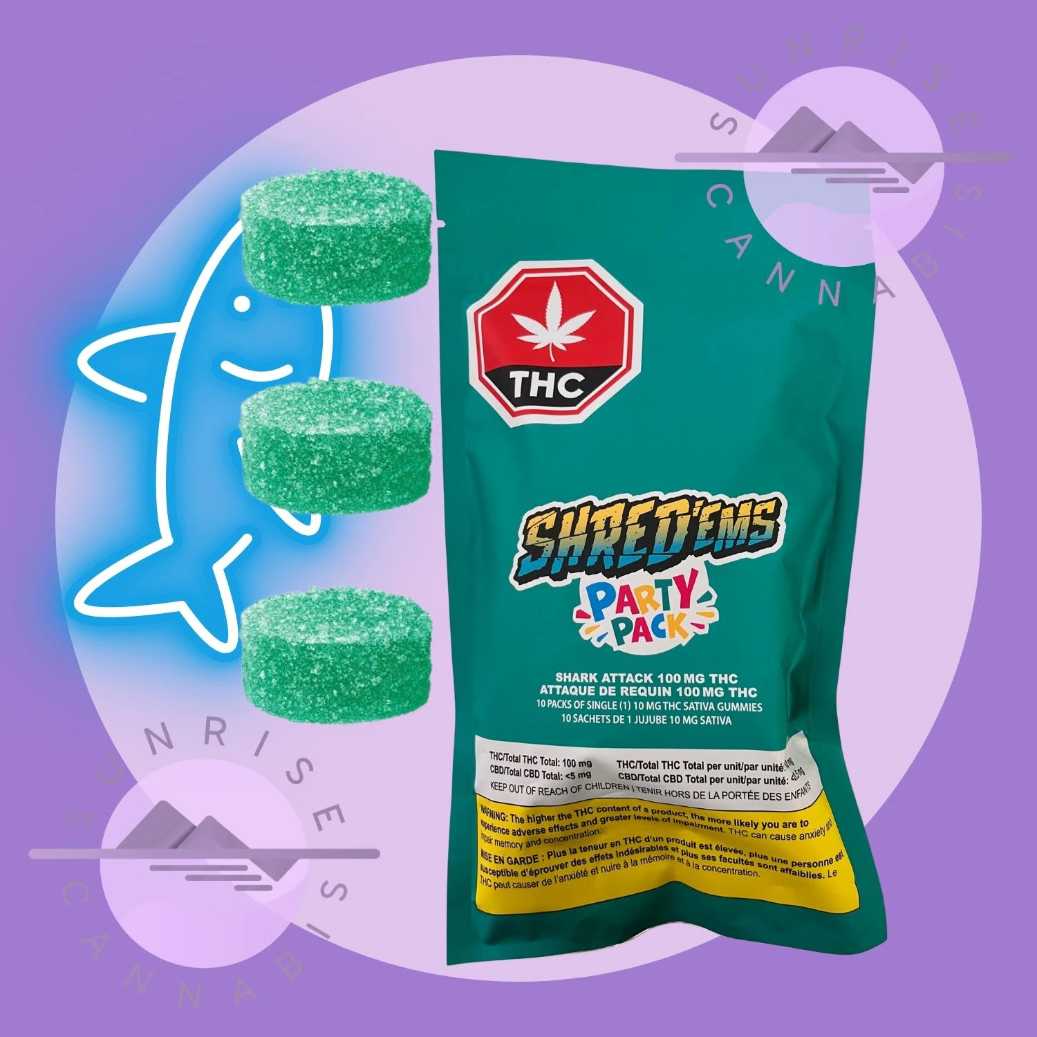 GUMMIES - 10x10MG THC SHRED’ems Shark Attack Party Pack has 10 packs of MAX10 gummies, each with 10mg THC for a total 100MG THC PER PACK! These sativa-dominant gummies unleash a fierce wave of jaw-dropping blue raspberry and green apple flavour.