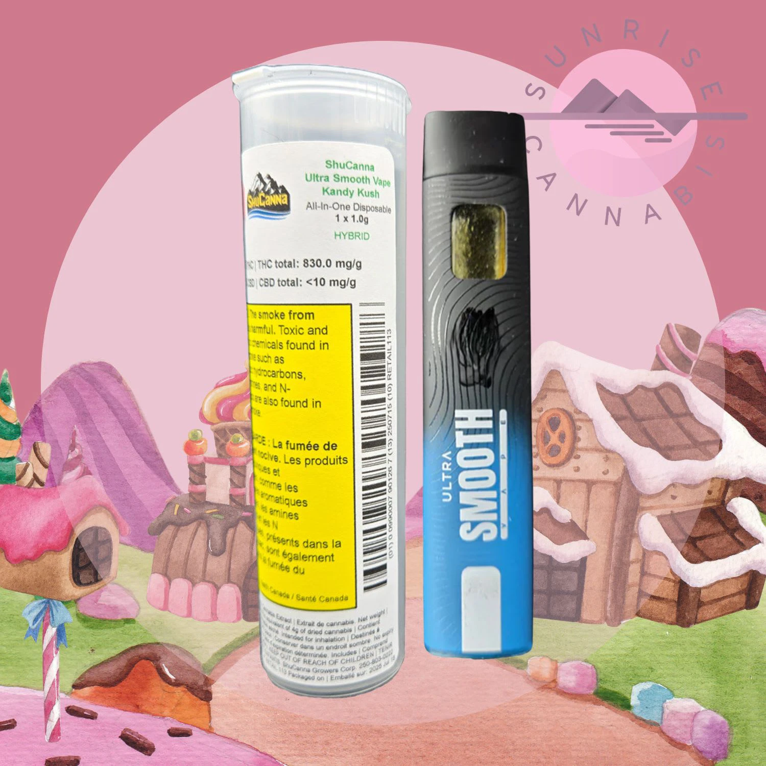 Introducing the cured resin Ultra Smooth AIO Vape with Mega Spectrum Kandy Kush oil — a hybrid strain that combines two California classics, OG Kush and Trainwreck. As the name suggests, the flavour is sweet like candy with a strong lemon-kush scent with no added flavours, colours or smells. Top terpenes are limonene, myrcene, and caryophyllene.