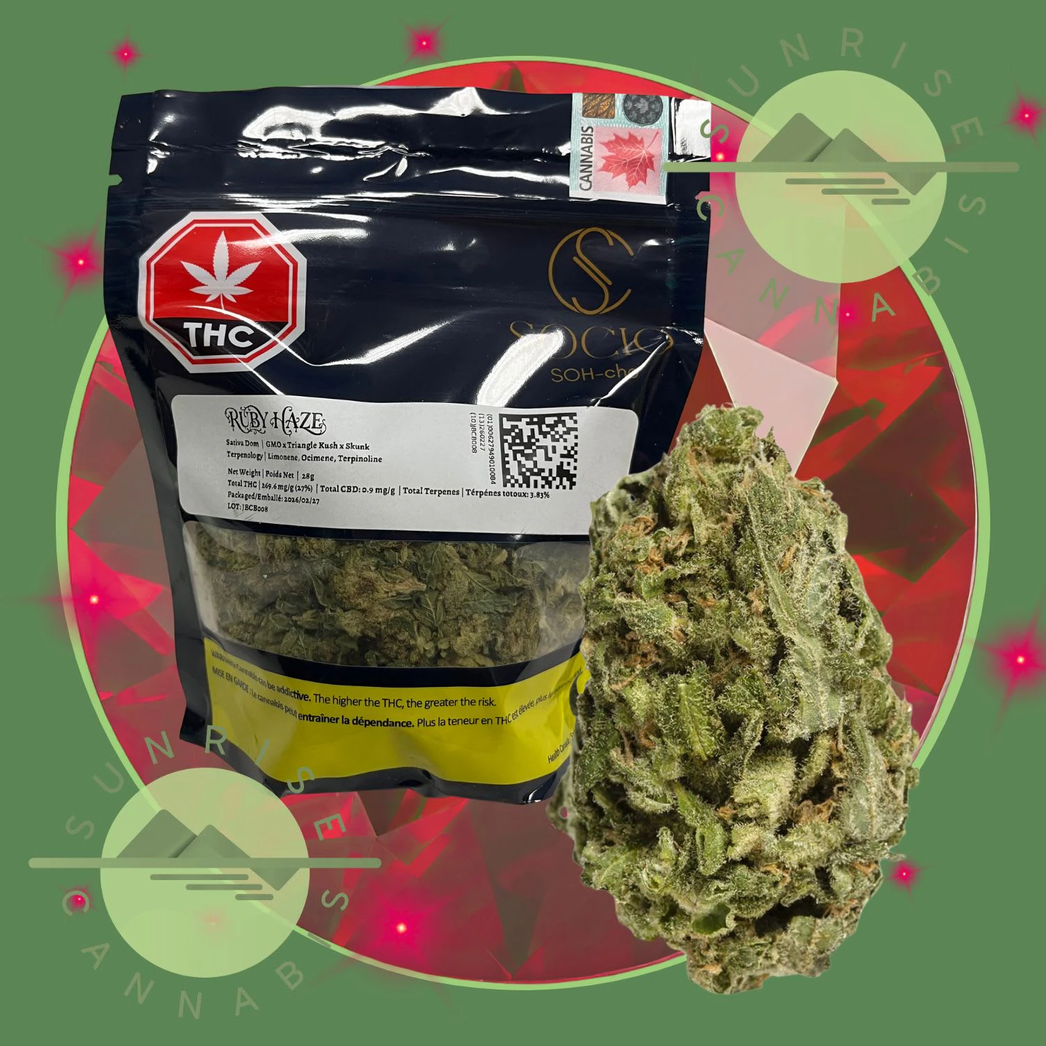 “Socio” means “partner” in Italian. The Socio brand was established to support smaller British Columbia craft cannabis partners in bringing their products to market. Socio collaborates with licensed producers to showcase small-batch, craft-grown flower. This batch of Ruby Haze was cultivated on Vancouver Island by The Jolly Boys, a high-voltage sativa bursting with cherry-charged flavour. This mouthwatering cultivar is born from Cherry Punch #4 and Black Cherry Punch #2, delivering bold notes of tart cherry and sweet berry layered with a zesty swirl of sugary spice. Available for limited-time-only.