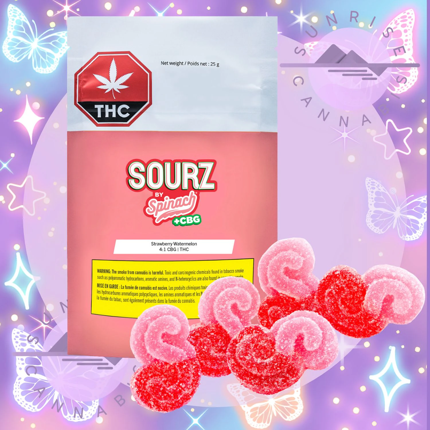 Sink your teeth into a juicy combination of strawberry and refreshing watermelon flavours with SOURZ by Spinach Strawberry Watermelon 4:1 CBG|THC gummies. With 8mg CBG and 2mg THC per gummy. These dual- flavoured gummies blasted with sour crystals are over-the-top with natural flavours. Enjoy five gummies per pack and 40mg CBG total and 10mg THC total.