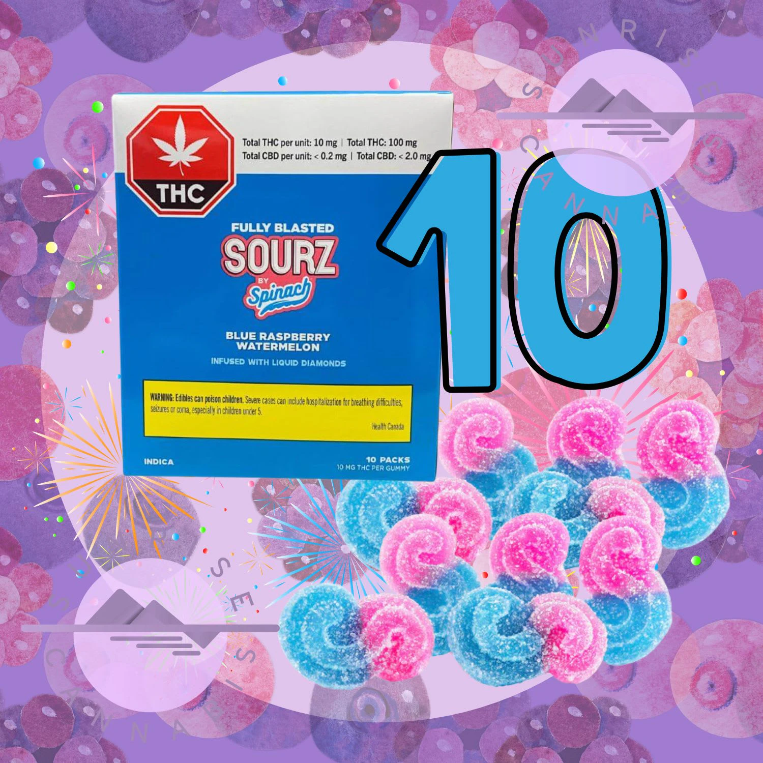 SOURZ by Spinach® Fully Blasted Blue Raspberry Watermelon gummies have 10mg of THC per piece. These dual-flavoured gummies are over-the-top with natural flavours and blasted with sour crystals. Enjoy 10 gummies with 10mg of THC per gummy and 100mg of THC total per pack.
