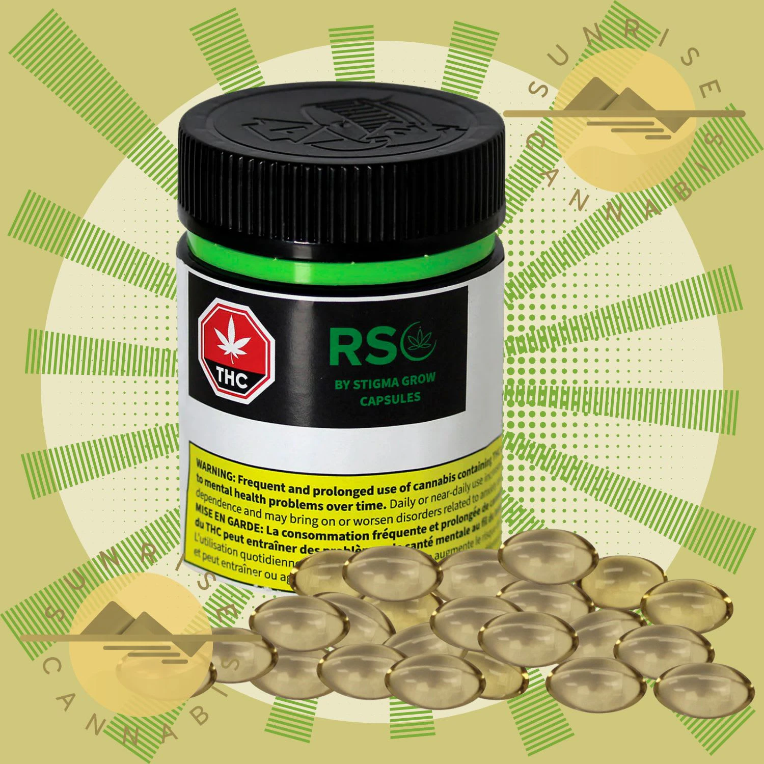 CAPSULES - RSO THC+CBD - 25 PACK 250MG THC / 25MG CBD Stigma Grow's RSO capsules contain full cannabis plant cannabinoids, terpenes, and flavonoids. Each of the 25 gelatin-based capsules contain 10mg of THC and 1mg of CBD in an MCT oil base.