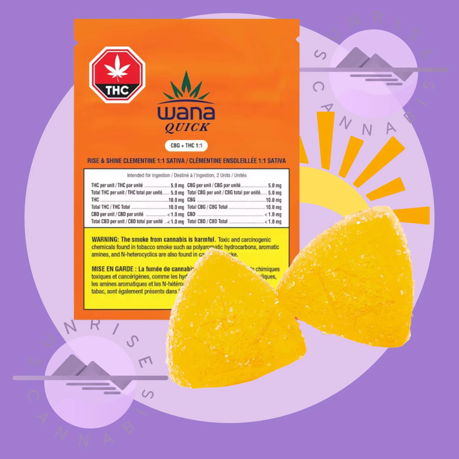 Wana Quick Rise & Shine Clementine 1:1 sativa gummies are bursting with sweet, juicy clementine flavour and infused with CBG, THC, and a proprietary sativa terpene blend. Made with a culinary innovation that may result in a quicker onset and offset of effects, each gummy contains 5 mg of CBG and 5 mg of THC. 2 gummies per package. Vegan and gluten-free.